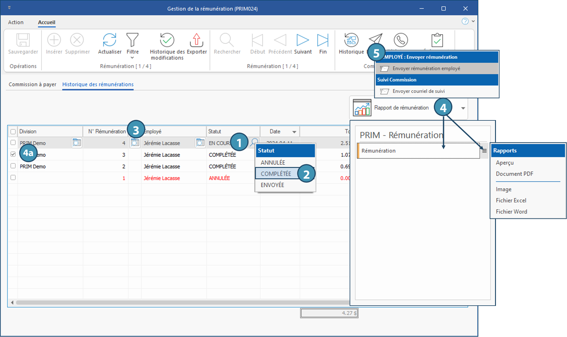 5.Il est possible d'envoyer le rapport de rémunération à un employé. Sélectionnez la ligne de la rémunération (la ligne sera grisée), puis cliquez sur dans le ruban Accueil et sélectionnez l'option Envoyer rémunération employé. Un courriel sera généré avec le rapport en pièce jointe sous forme de lien, et l'employé sera coché dans les destinataires.
