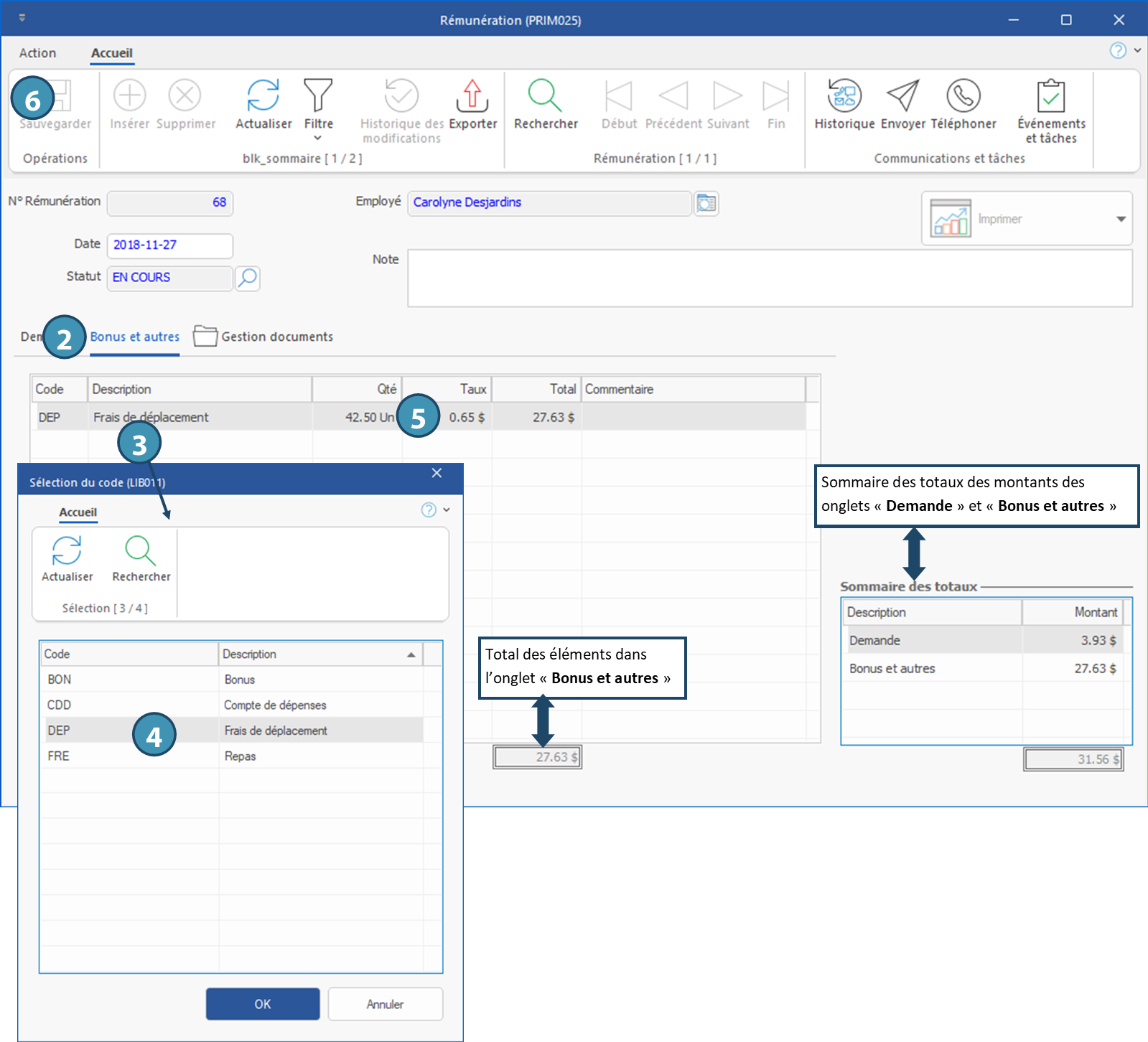 1.Ouvrez la fenêtre Rémunération. 2.Déplacez-vous sous l'onglet Bonus et autres. 3.Cliquez dans la zone principale pour afficher la fenêtre Sélection du code. 4.Sélectionnez l'élément à ajouter, cliquez sur OK. 5.Ajoutez ou modifiez le montant dans les colonnes Qté ou Taux. 6.Cliquez sur