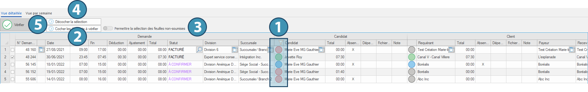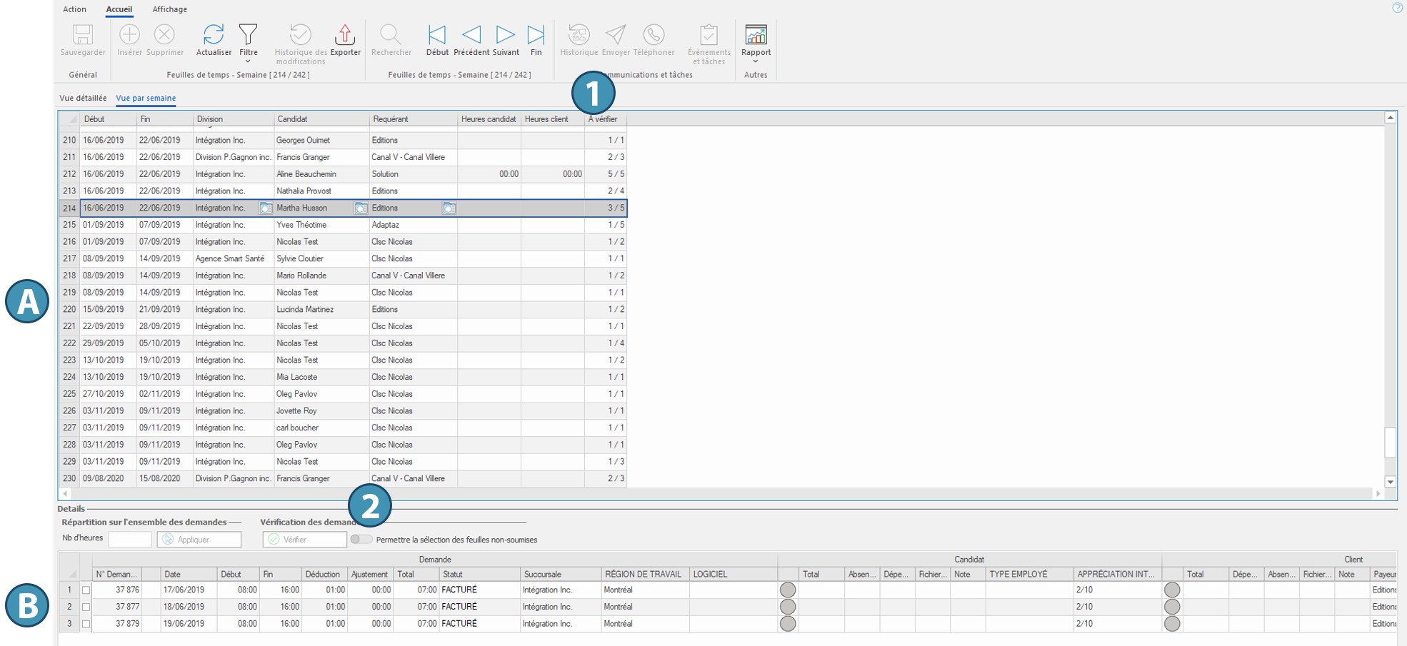 Le tableau principal (A) affiche toutes les semaines pour lesquelles existent une ou plusieurs feuilles de temps. Chaque ligne correspond aux feuilles de temps liant un candidat et un client durant une semaine de travail. La colonne « A vérifier » (1) indique le nombre de feuilles restantes à vérifier par rapport au nombre total de feuilles de temps incluses dans cette période.