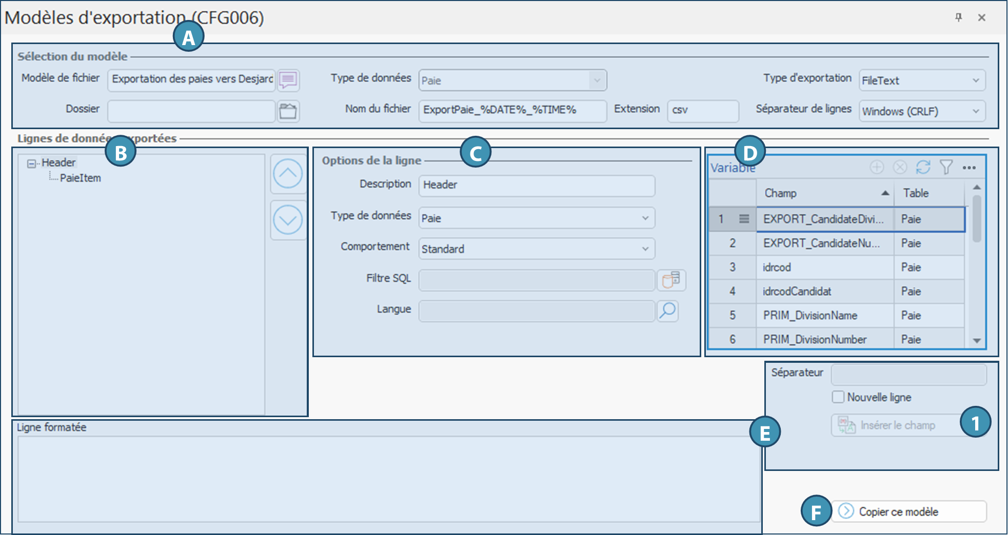 Représente la structure hiérarchique des blocs de données à exporter. Les éléments indiqués ici sont des termes génériques à titre d'exemple. Dans l'illustration ci-dessous, la ligne Header correspondrait à la catégorie des données à exporter, et la ligne "PaieItem" à une des données exportées. Ces éléments sont ajoutés et défnis lors de la création dans la section C. Leur désignation sera donc différente et personnalisée selon le modèle.