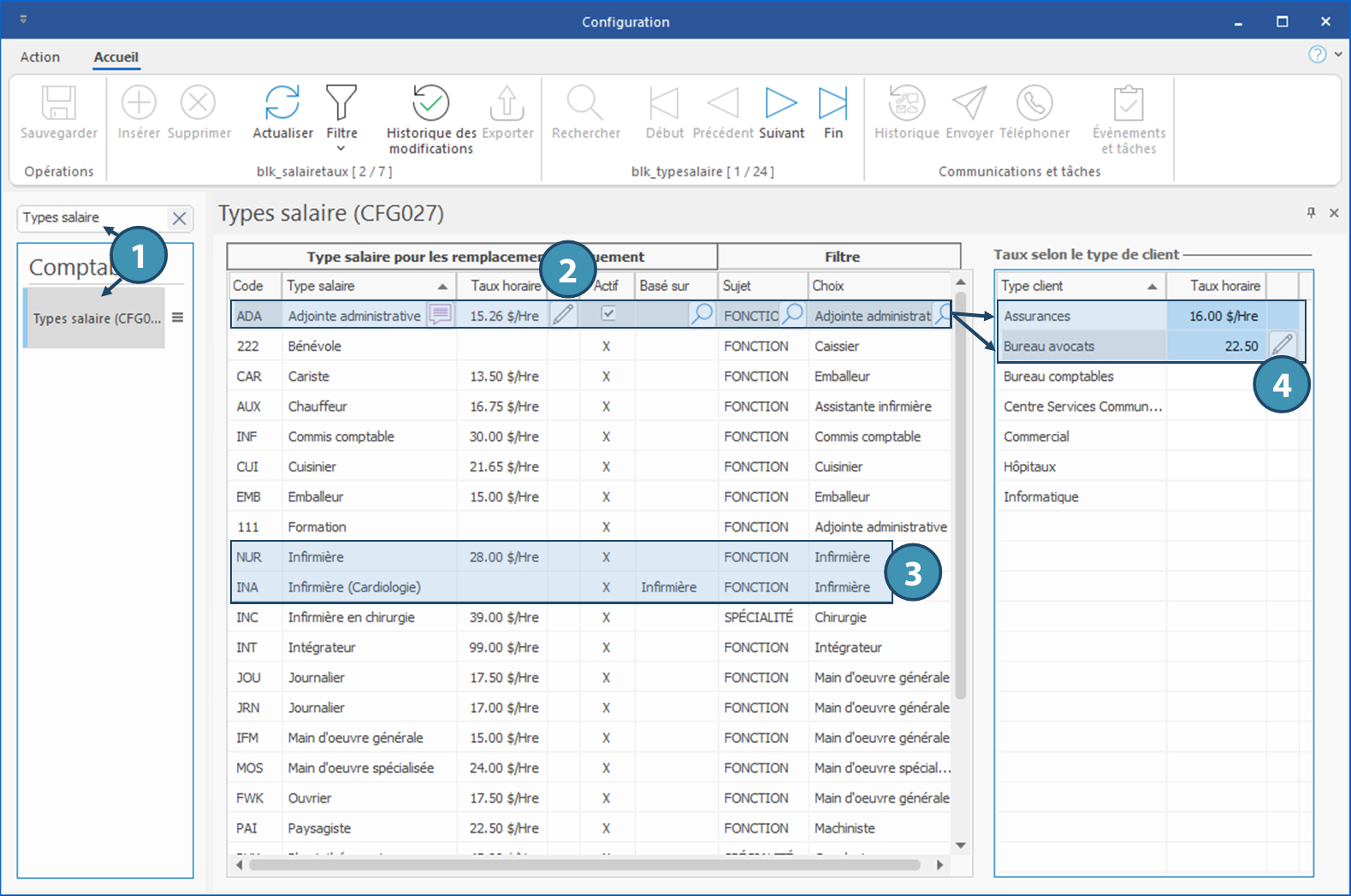 Le taux horaire payé pour une adjointe administrative est de 15,26 $. Toutefois, chez les clients de type « Assurances », il sera de 16 $ et chez les clients de type « Bureau avocats », il sera de 22,50 $.