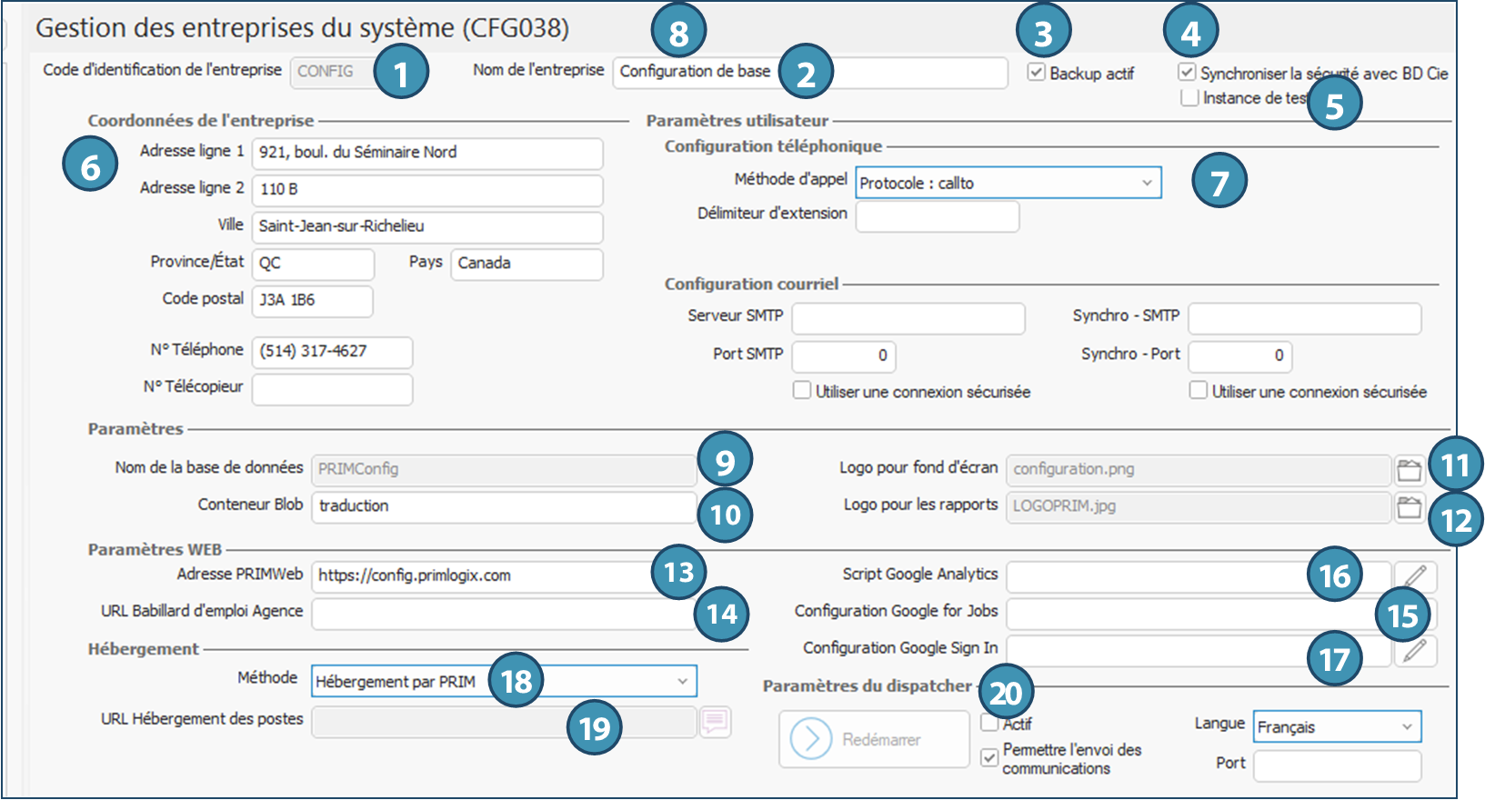 13.Adresse PRIMWeb : Contient l’URL du portail Web de l’entreprise. Notez que chaque division peut avoir un portail personnalisé, et la personnsalisation aura alors préséance sur ce qui est configuré ici. Si aucune information n’est indiquée dans la division, c’est cette URL qui est utilisée (ex : l’URL de la fiche d’un poste).