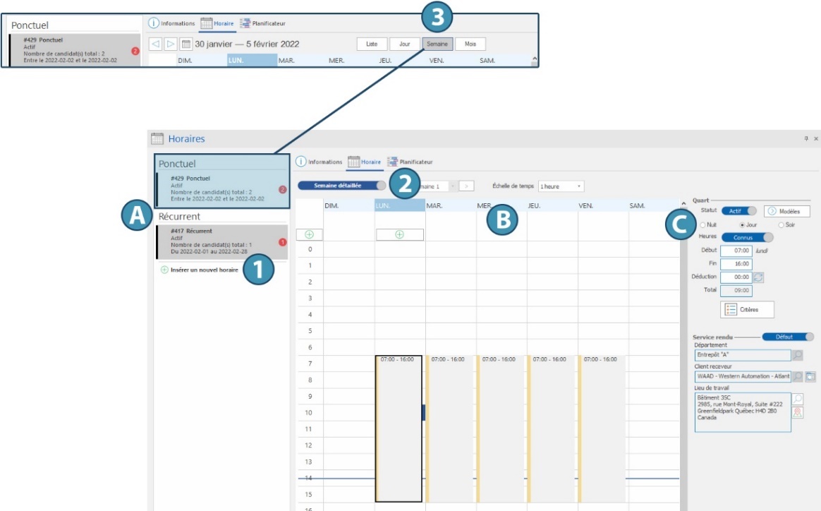 Les horaires liés à la mission apparaissent dans le menu de gauche (A). Cliquez sur le bouton correspondant pour ajouter un horaire à la liste (1). Ils sont classés selon leur type. Chaque horaire est détaillé dans le calendrier central (B). Enfin, en sélectionnant un quart dans le calendrier, les informations propres à celui-ci sont affichées à droite (C).