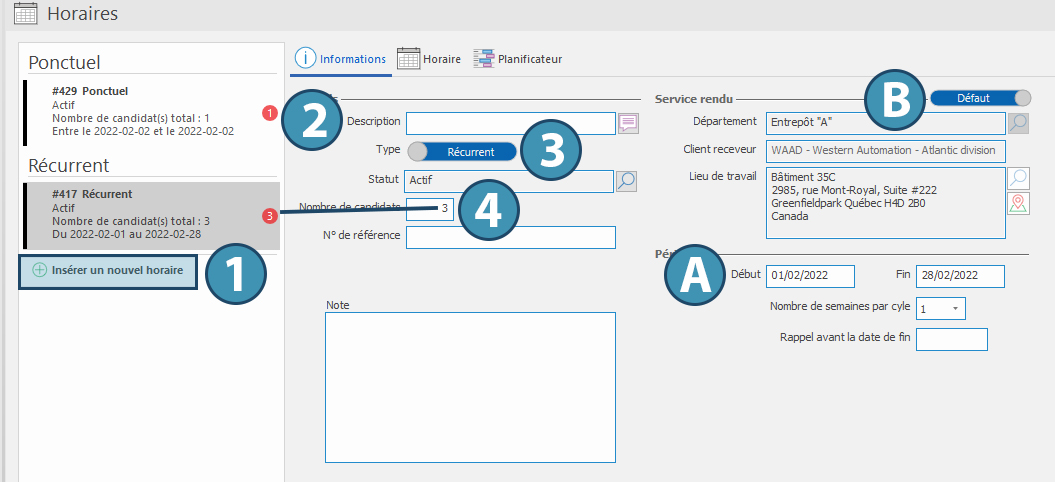 Un horaire récurrent doit obligatoirement avoir une date de début (A) pour être créé. De même, il est alors demandé de spécifier le nombre de semaines comprises dans chaque cycle.