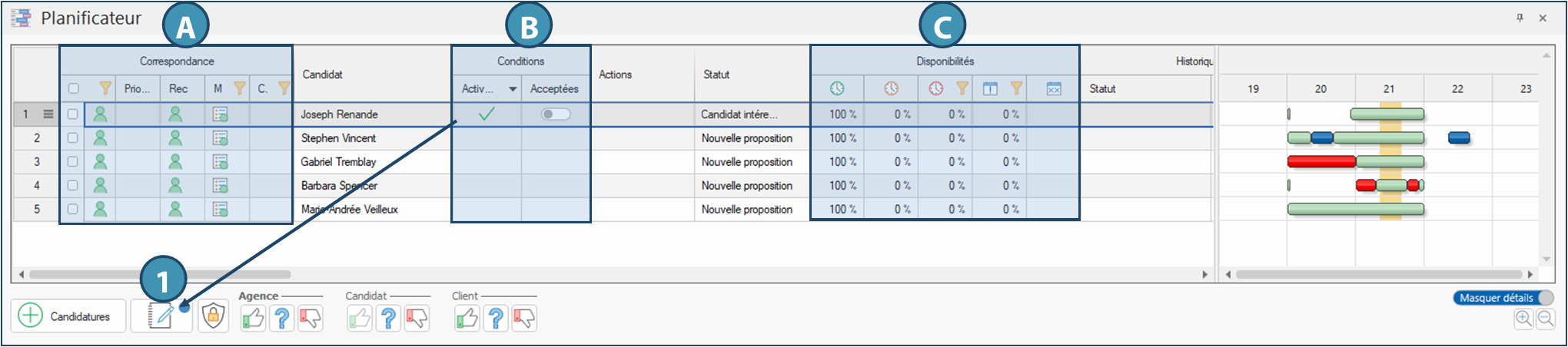 En activant le détail des disponibilités, vous afficherez, à droite du planificateur, un calendrier qui permet d’observer, pour chaque candidat, ses disponibilités par rapport à la demande.