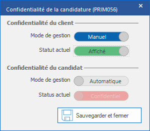 Paramétrer la confidentialité de la candidature vis-à-vis du candidat et du client. Choisissez un mode de gestion – Automatique ou Manuel – puis indiquez si vous souhaitez que la candidature soit visible par l’entité concernée. Pour plus d'information sur la configuration et la gestion automatique de la confidentialité, voir la section correspondante. (Page en création, hyperlien à ajouter)