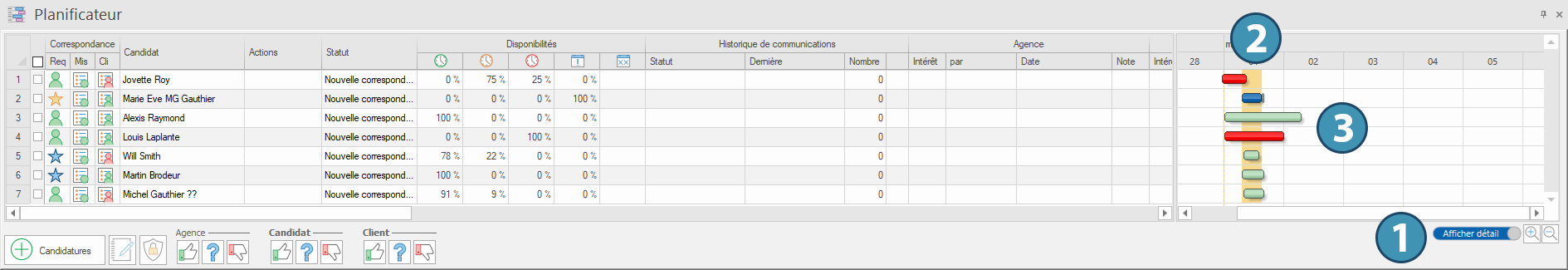La demande dernière est indiquée par un trait vertical jaune (2). Les disponibilités, non-disponibilités et affectations de chaque candidat sont illusrées par des bandes horizontales respectivement vertes, rouges et bleues (3). Enfin, une barre horizontale mauve est affichée lorsque le candidat est affecté à la demande.