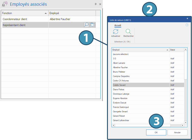 2.La fenêtre de sélection des employés associés au client s'affiche.