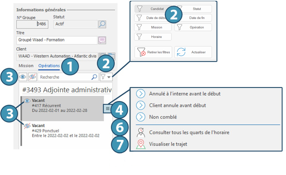 Le volet Opérations (1) fonctionne de pair avec l’onglet « Opérations » (2), intrinsèque à la fenêtre des quarts groupés, dans lequel chaque « combinaison horaire + candidat » est présentée sous forme de liste et classée par mission (3).
