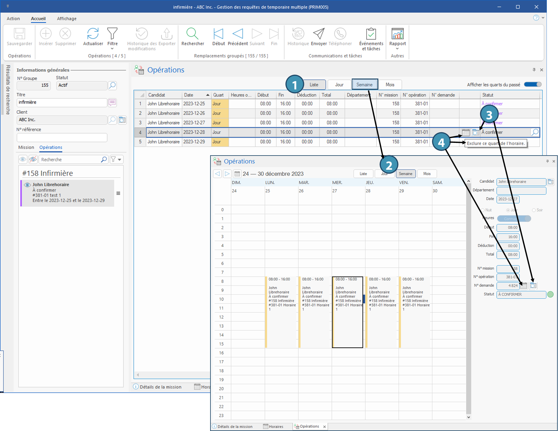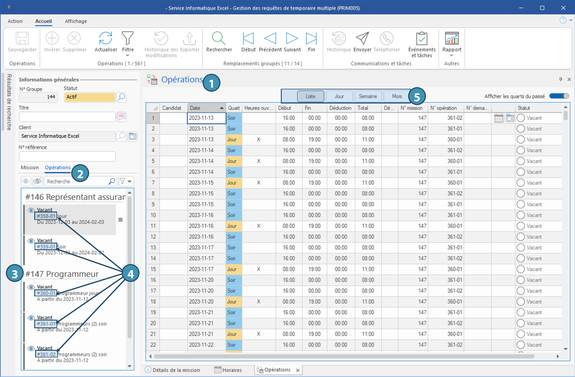 Le volet des opérations, quant à lui, permet de voir chacun des quarts inclus dans la demande groupée et permet 4 modes d’affichage : par jour, par semaine ou par mois, ainsi qu’un affichage sous forme de liste (5).