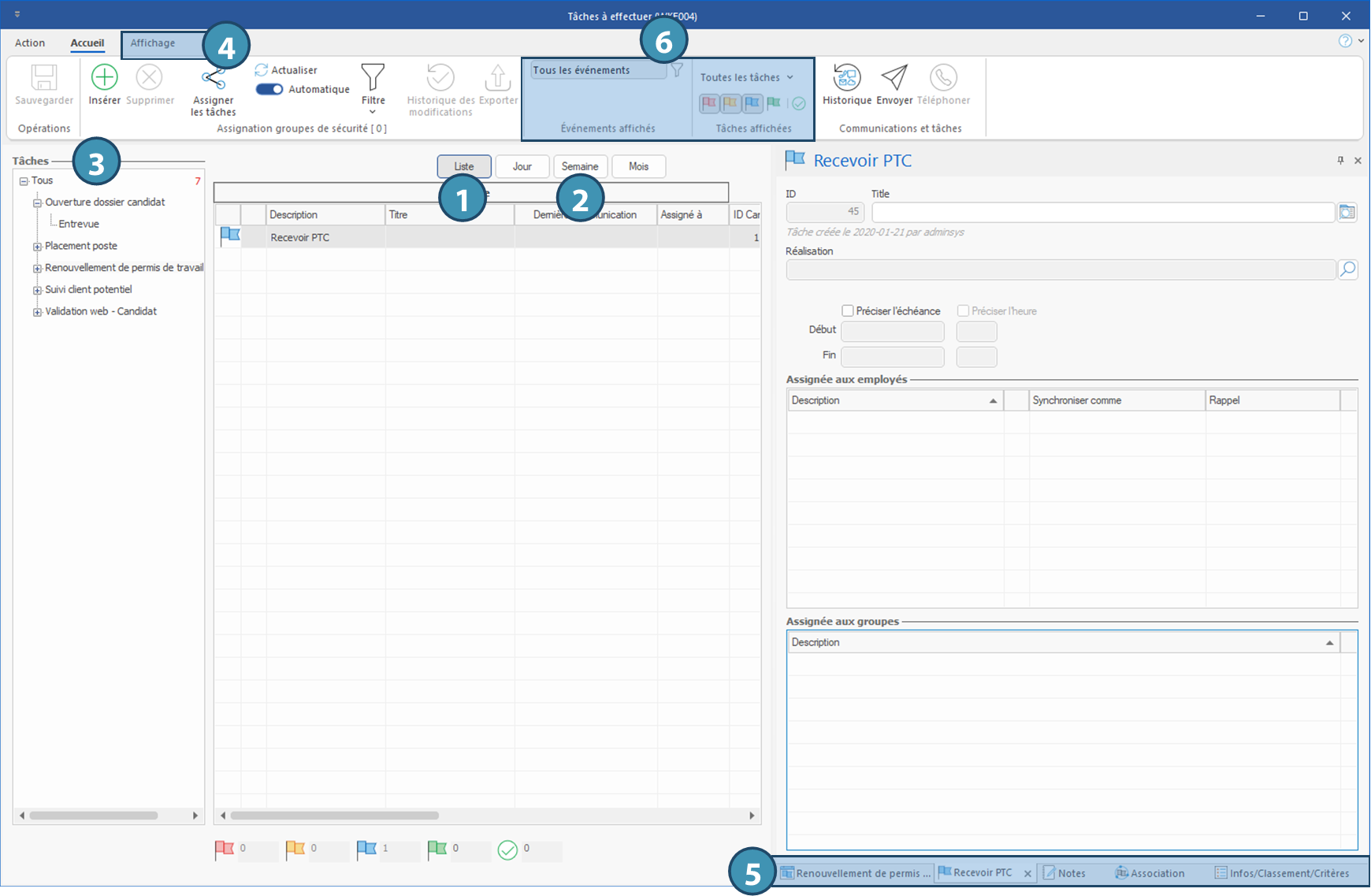 Les fenêtres « Tâches à effectuer » (WKF004) et « Gestion des événements et des tâches » (WKF011) affichent l'information sur la progression des tâches liées à un événement en cours, de la création à l'archivage. Pour les détails sur la création d'un événement,veuillez consultez l'article Gestion des événements et des tâches. (à venir)