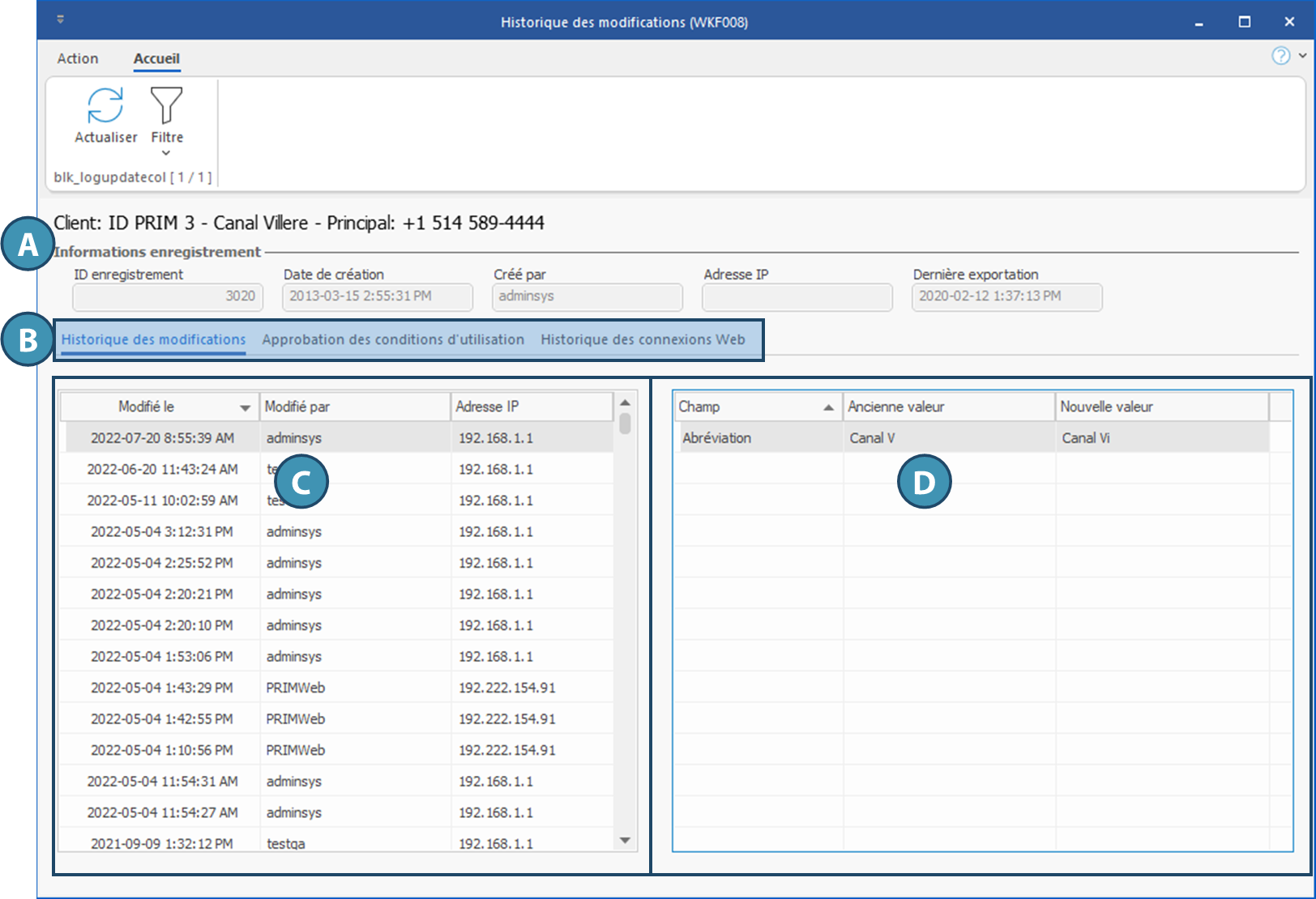 •Historique des modifications : on y retrouve la liste de toutes les modifications apportées à la fiche ou à l'élément concerné