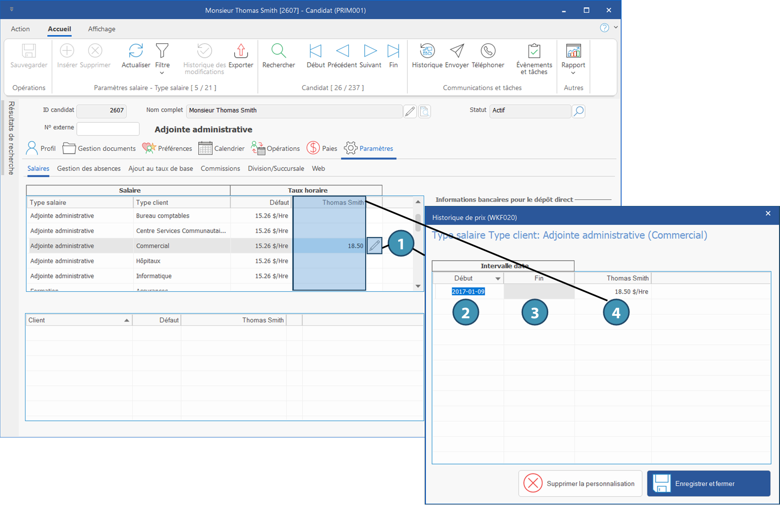 Dans l'exemple ci-dessous le taux horaire est modifié pourl e salaire d'un candidat.