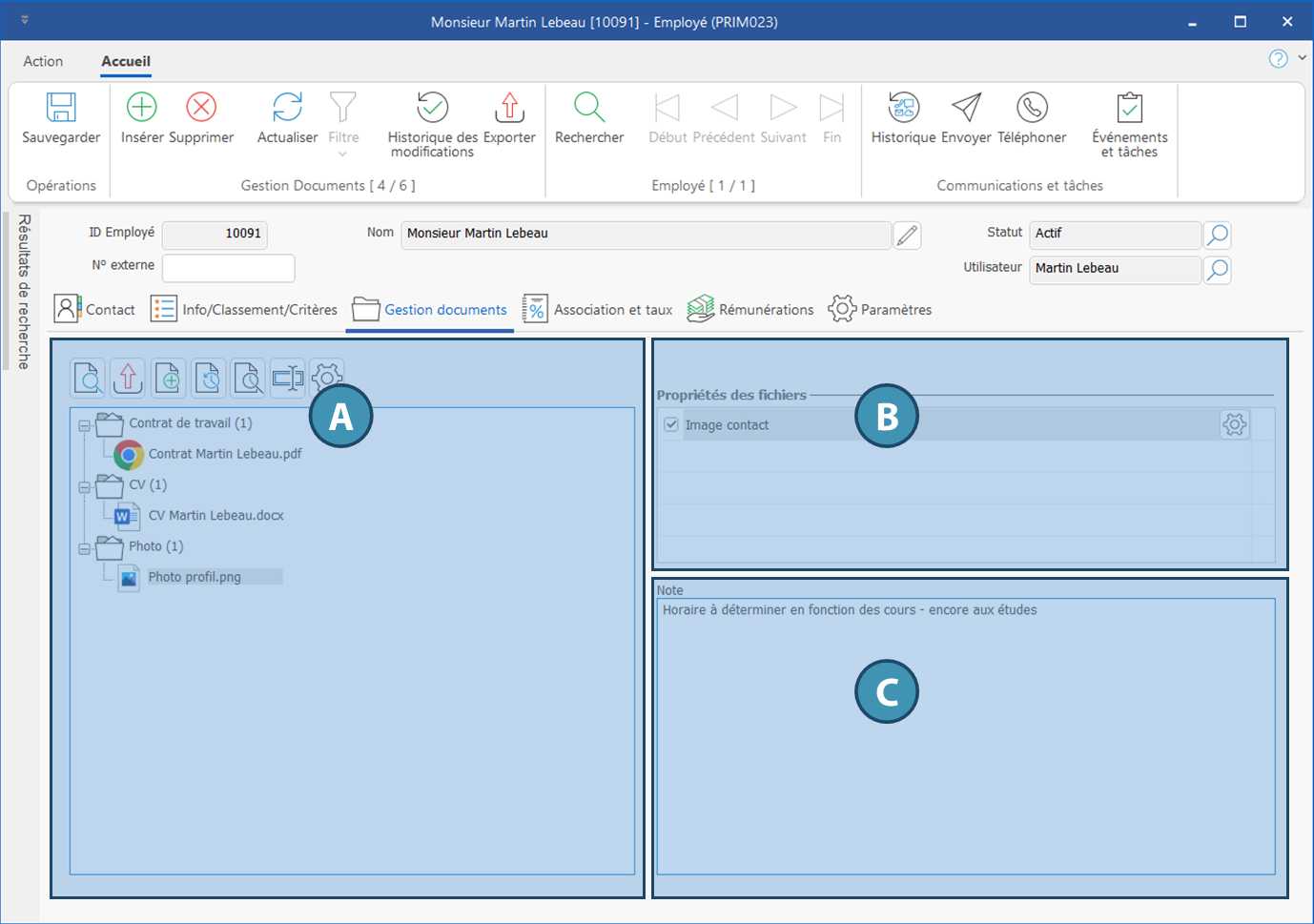 A. Fichiers joints répartis par catégories de documents et barre d'outils pour la gestion des documents. Contient touus les documents reliés à l'employé, comme le contrat de travail.