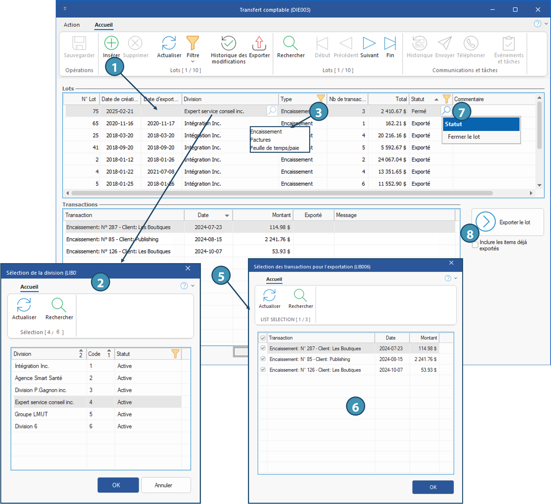 Il est recommandé de faire des exportations de données financières fréquemment afin d'éviter les longues listes de données à vérifier avant la fermeture du lot.