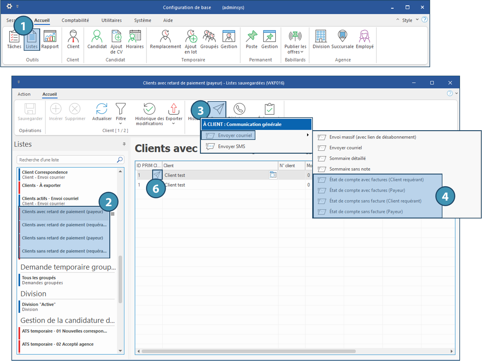 La façon la plus simple et rapide d’envoyer un état de compte à plusieurs clients simultanément est d’utiliser une liste. Des listes sont préconfigurées à cet effet.