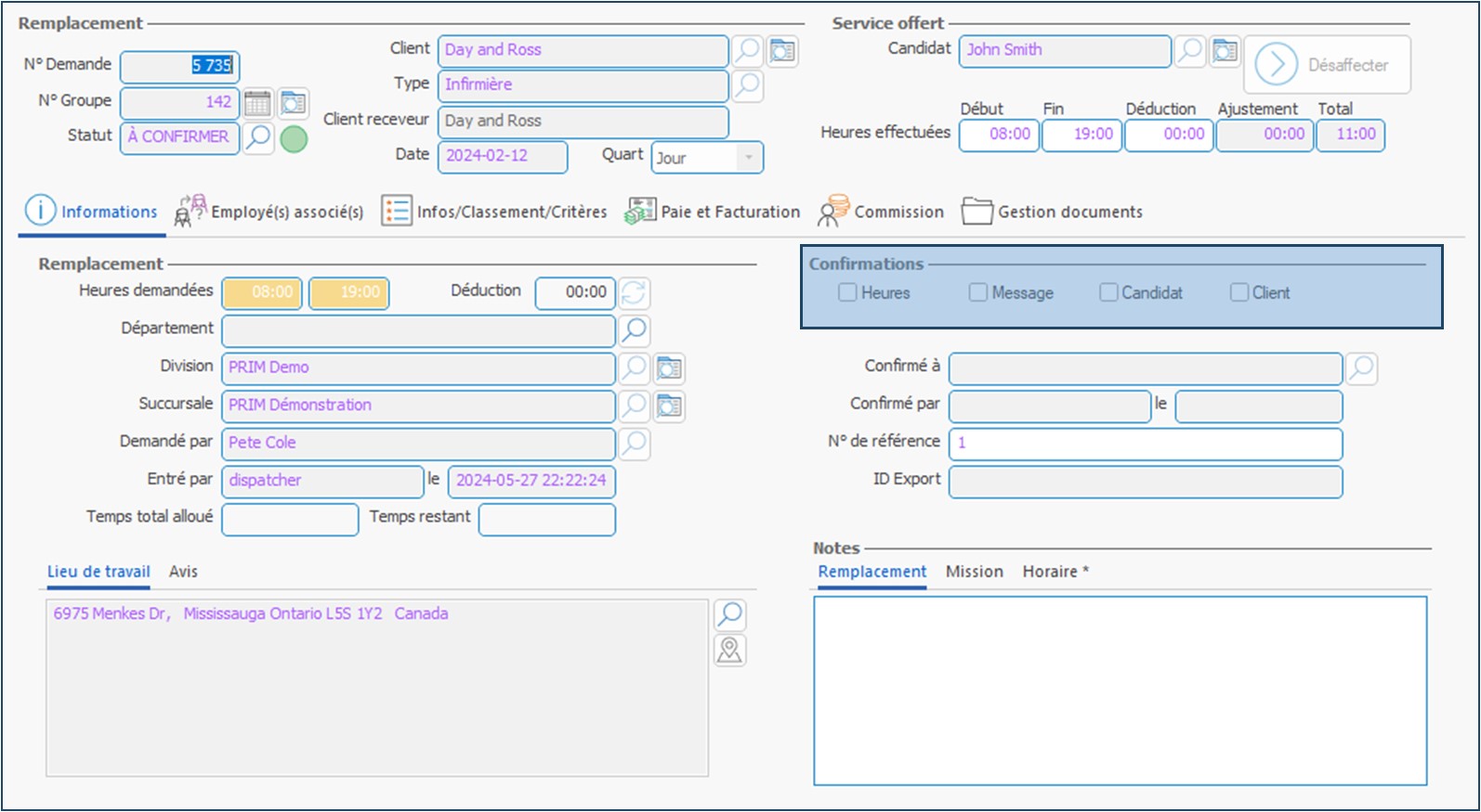 Si un candidat affecté à un horaire de demande groupée doit s'absenter pour un ou plusieurs quarts de l'horaire, ou si un quart est annulé par le client, à moins que l'annulation soit sur l'ensemble de l'horaire, celle-ci doit être faite sur chacun des quarts ponctuels concernés. Il s'agit simplement de modifier le statut du ou des quart(s) concerné(s). Il est possible de modifier le statut dans la fenêtre Quart (PRIM014), ou encore de le modifier dans le volet Opérations en mode liste.