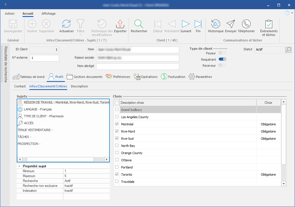 Dans la fenêtre client, on retrouve ce qui caractérise le client, et des informations complémentaires à propos de celui-ci.