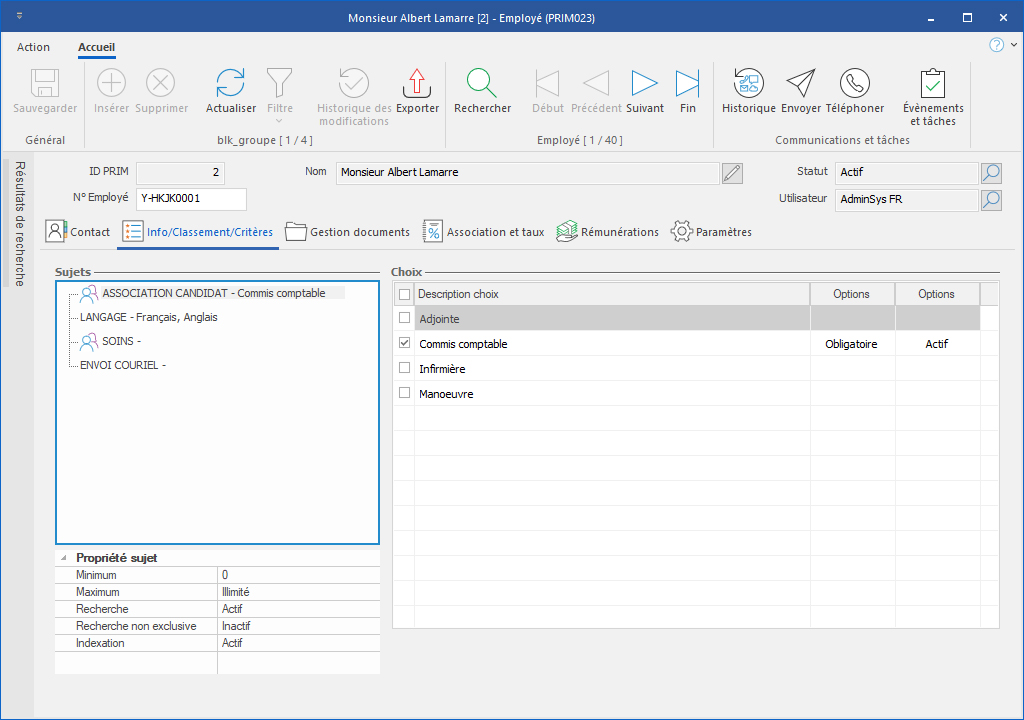 Dans la fenêtre employé, on retrouve ce qui caractérise l'employé, et des informations complémentaires à propos de celui-ci.