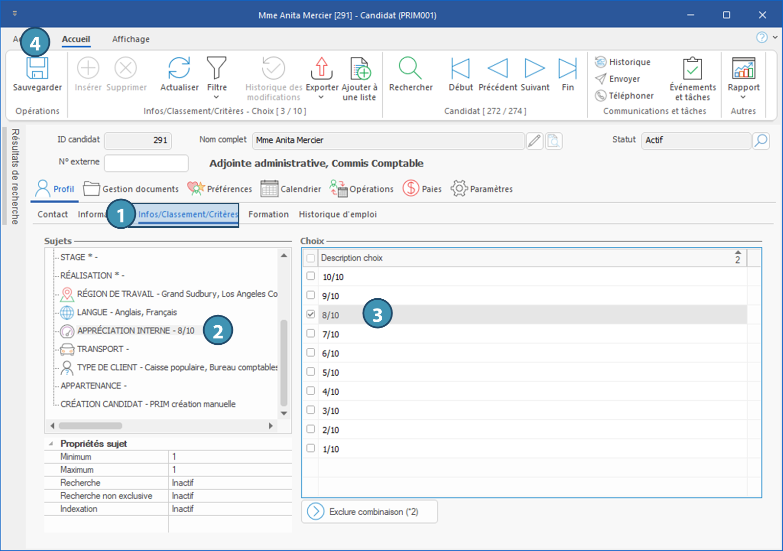 1.Depuis le dossier d'un candidat, déplacez-vous sous l'onglet Info/Classement/Critères.