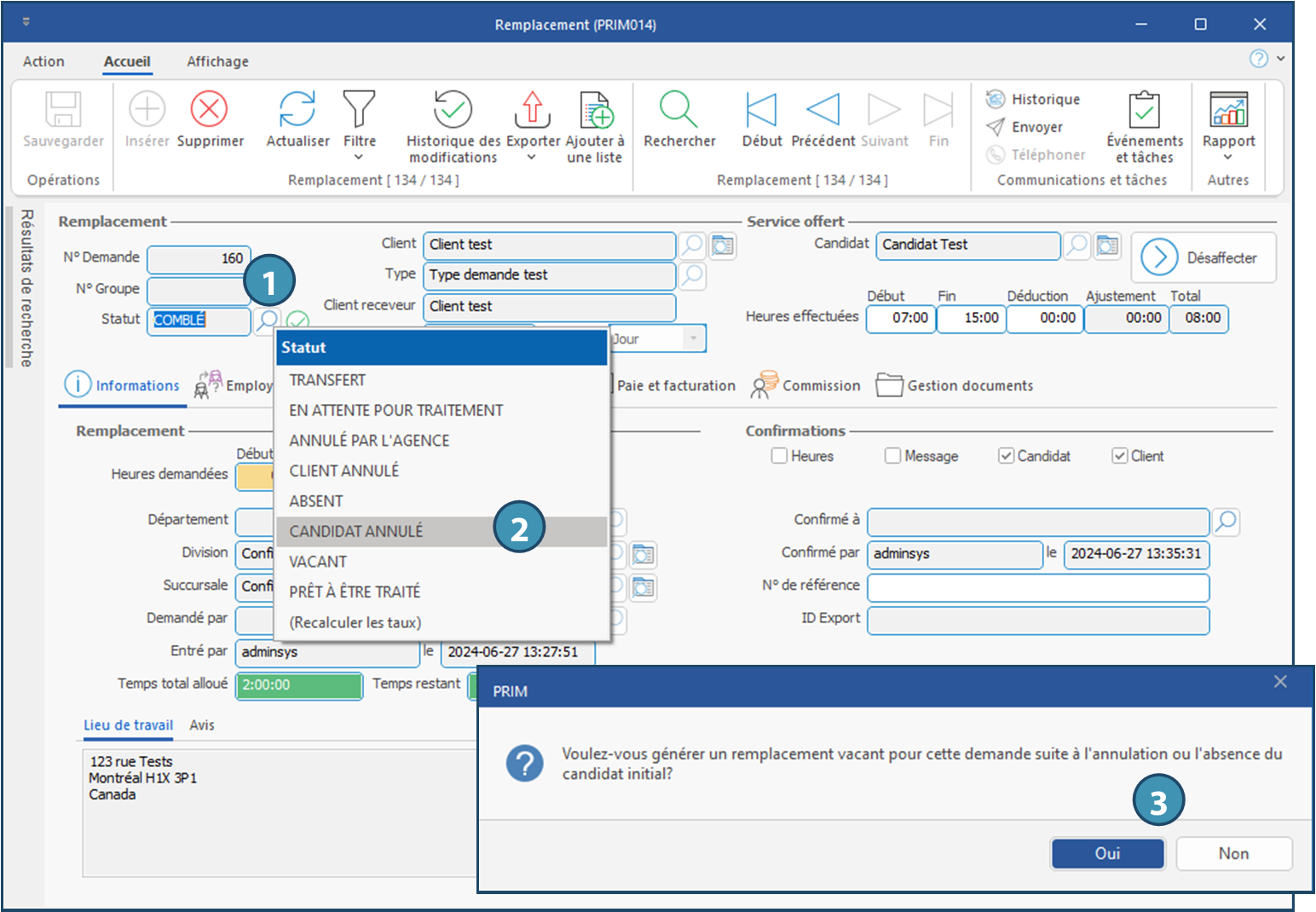 Selon votre choix, un message pourrait s'afficher. Dans l'exemple ci-dessous, nous avons choisi le statut « Candidat annulé » : PRIM demande alors si une copie du quart doit être créée, ce qui permettra de recommencer le processus d'affectation avec un nouveau candidat, tout en tenant compte de ce qui a été fait dans le quart initial. (3)