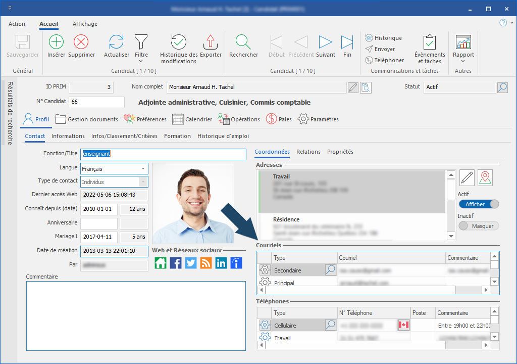 Dans l'image ci-dessous, la zone sélectionnée est la liste des adresses courriel, elle est facilement repérable grâce à son contour bleu. Les options du menu principal sont en lien avec la zone choisie.