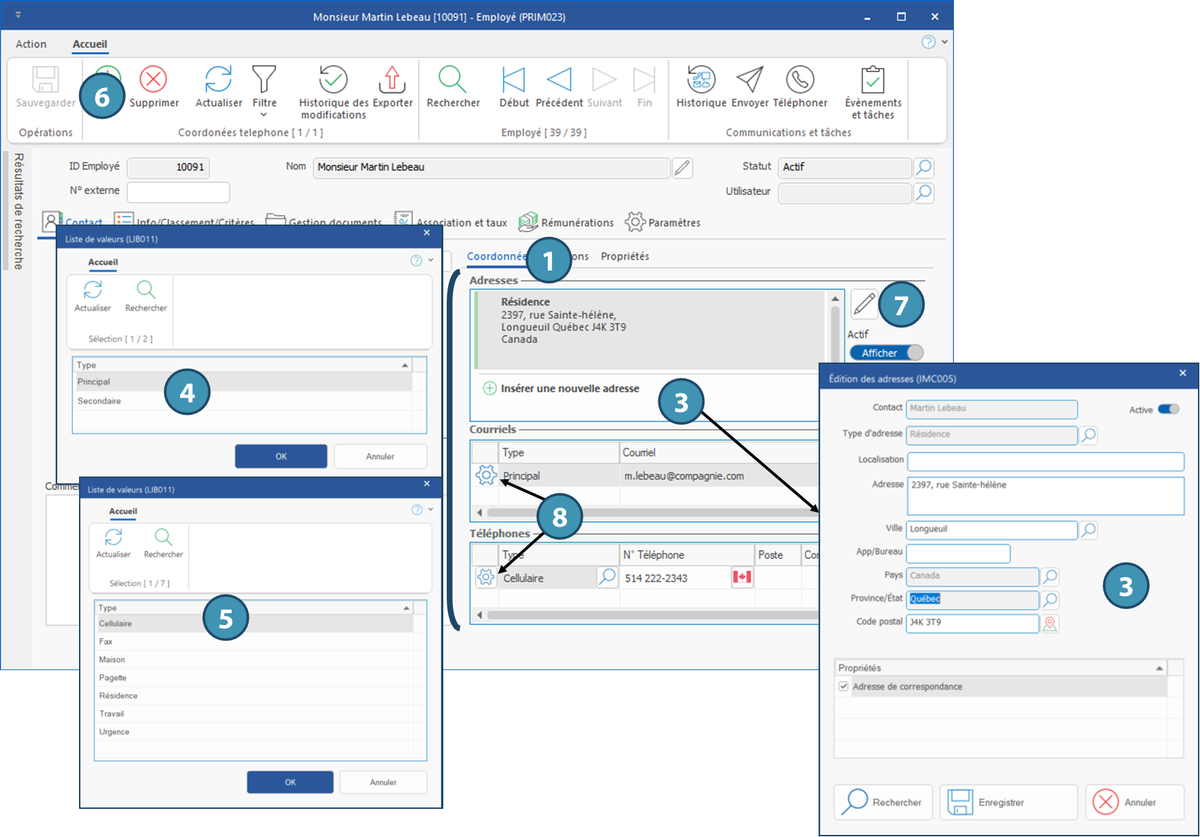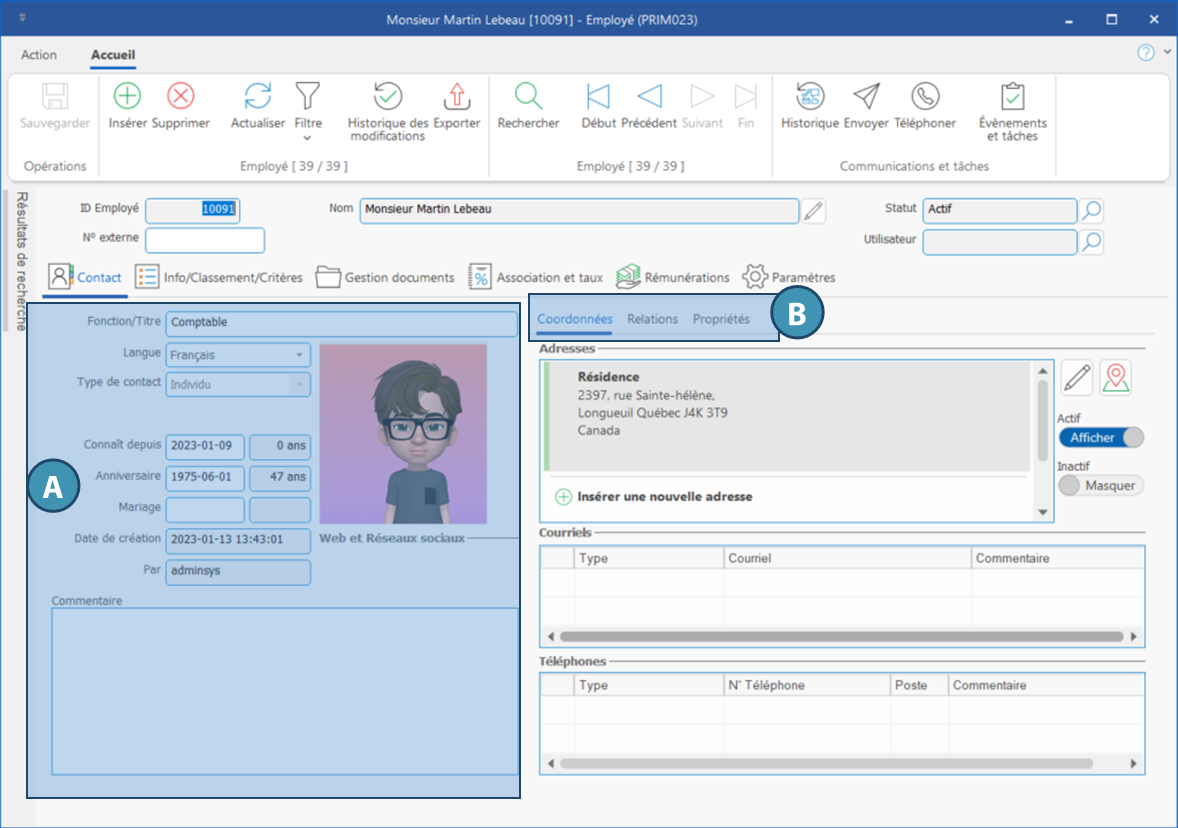 L'onglet « Contact » présente certains renseignements généraux sur l'employé, ainsi que ses coordonnées et relations. En plus d'une section générale (A), il comporte 3 sous-onglets (B) : Coordonnées, Relations et Propriétés