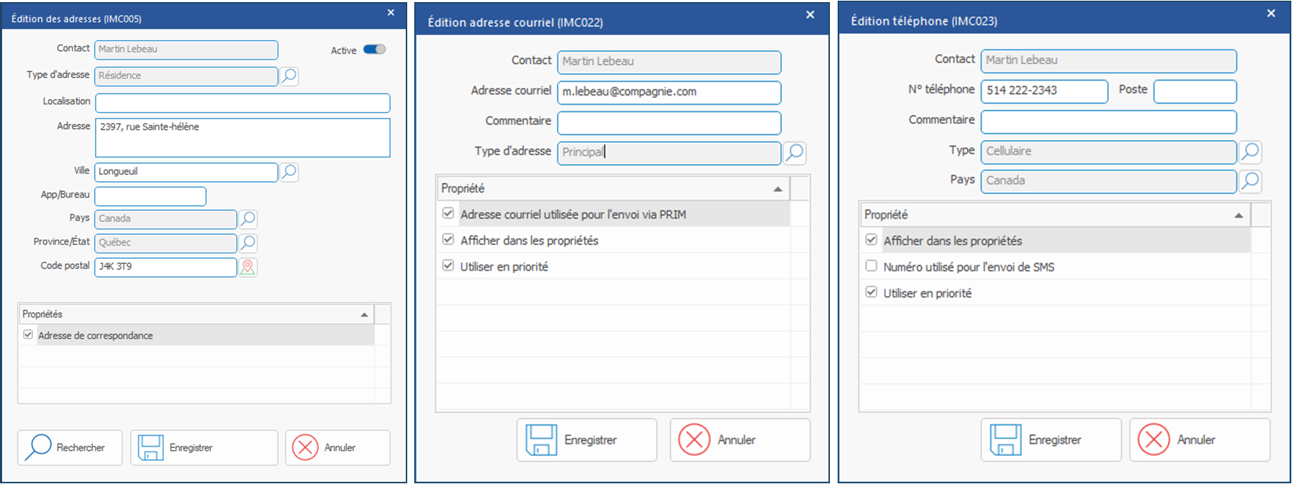 2.Sélectionnez la zone dans laquelle vous voulez ajouter ou modifier une information, soit Adresses, Courriels ou Téléphones