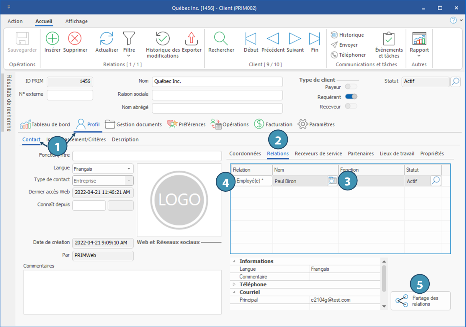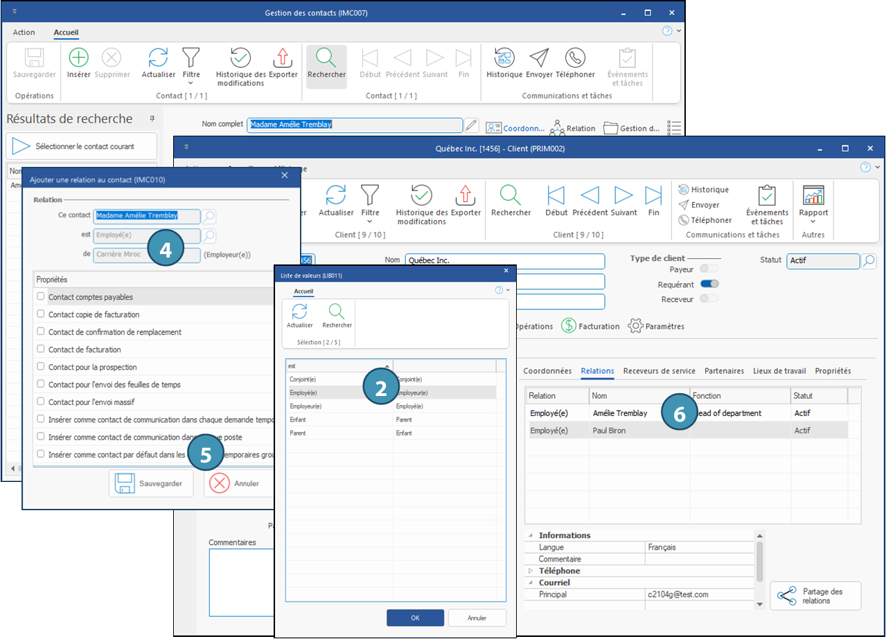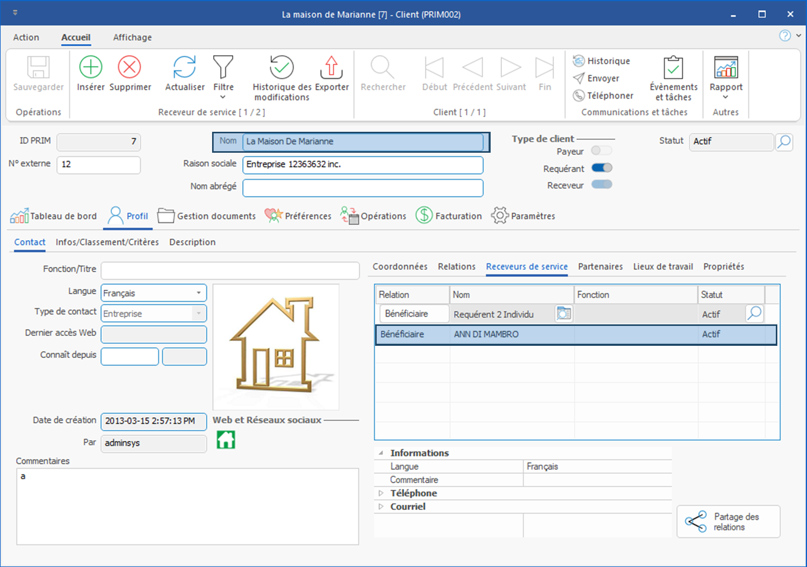6.Naviguons maintenant dans le profil du client « La maison de Marianne » pour vérifier que ce client possède maintenant la relation avec « ANN DI MAMBRO », à titre de receveur de service. 7.