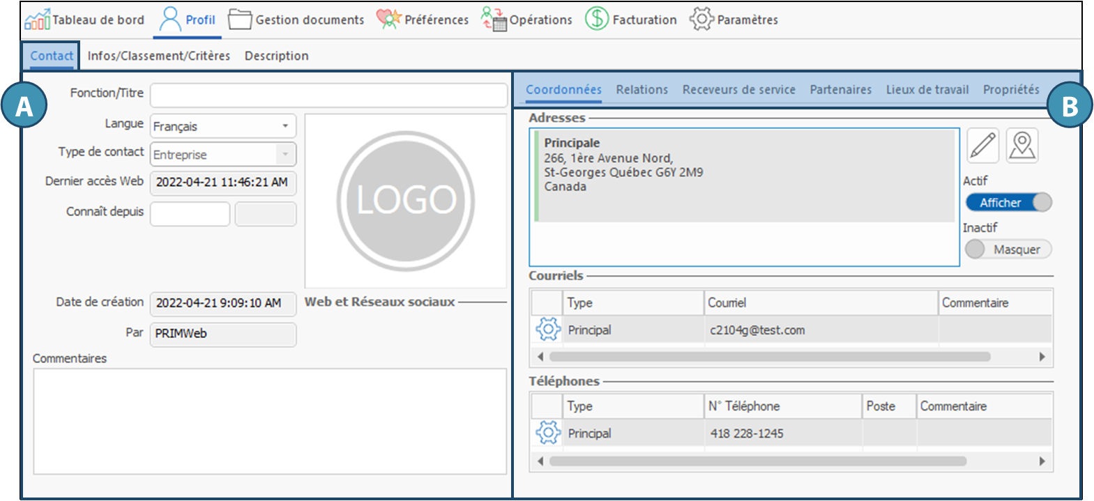 Ce sous-onglet de l'onglet Profil présente les diverses coordonnées de l'entreprise ainsi que certains renseignements de base, comme la date de création, la langue de communication privilégiée par le client, la fonction de l'entreprise.