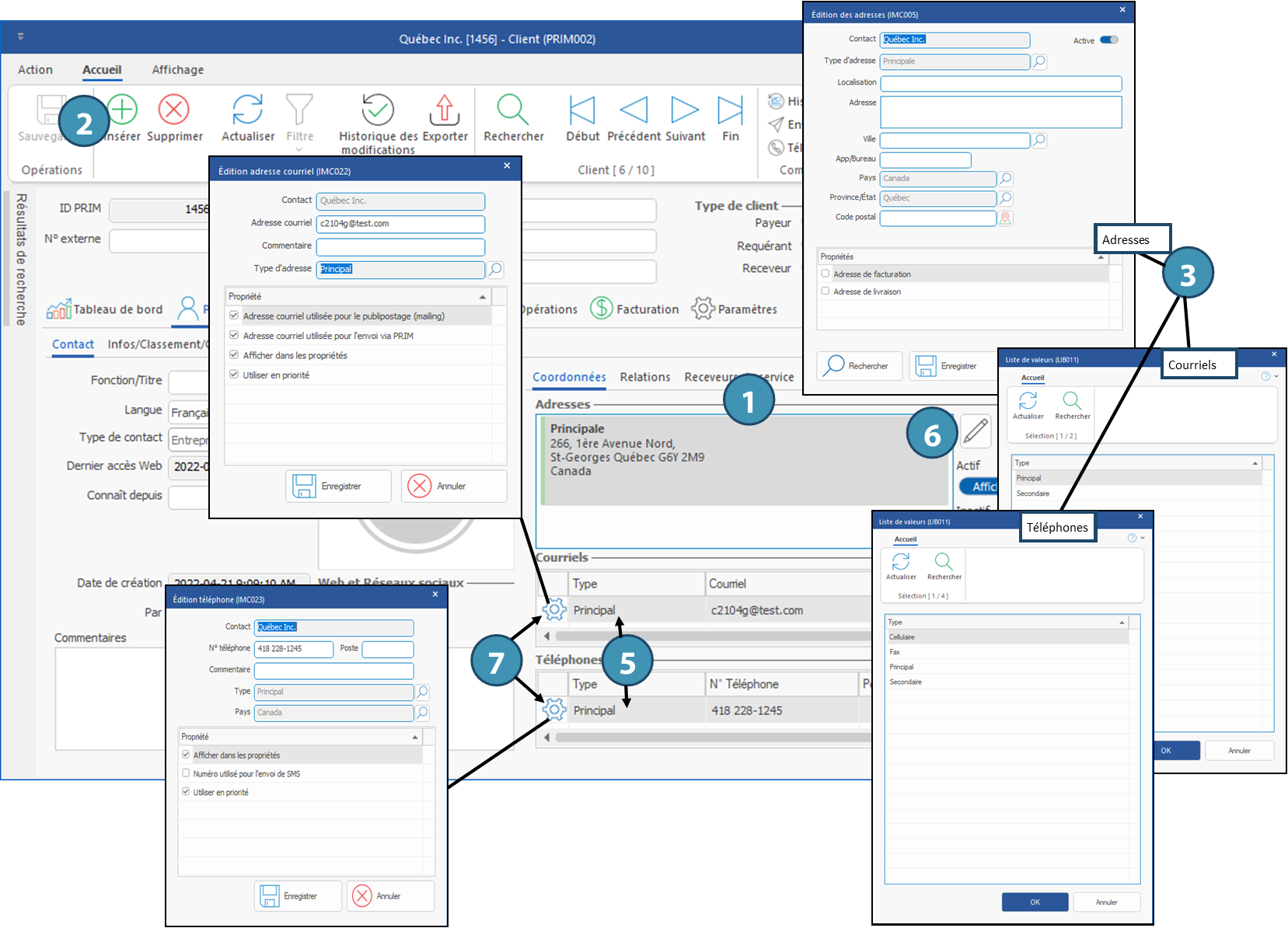 Ce sous-onglet permet d'ajouter les coordonnées principales du client : adresses, courriels, numéros de téléphone.