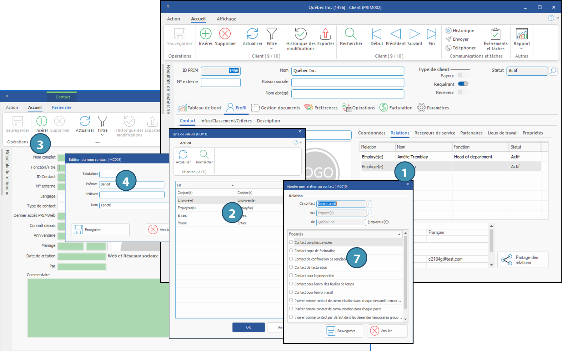 Ce sous-onglet permet de désigner des contacts comme relations du client. Ces contacts pourraient déjà exister dans PRIM ou encore être créés à partir de cet onglet.