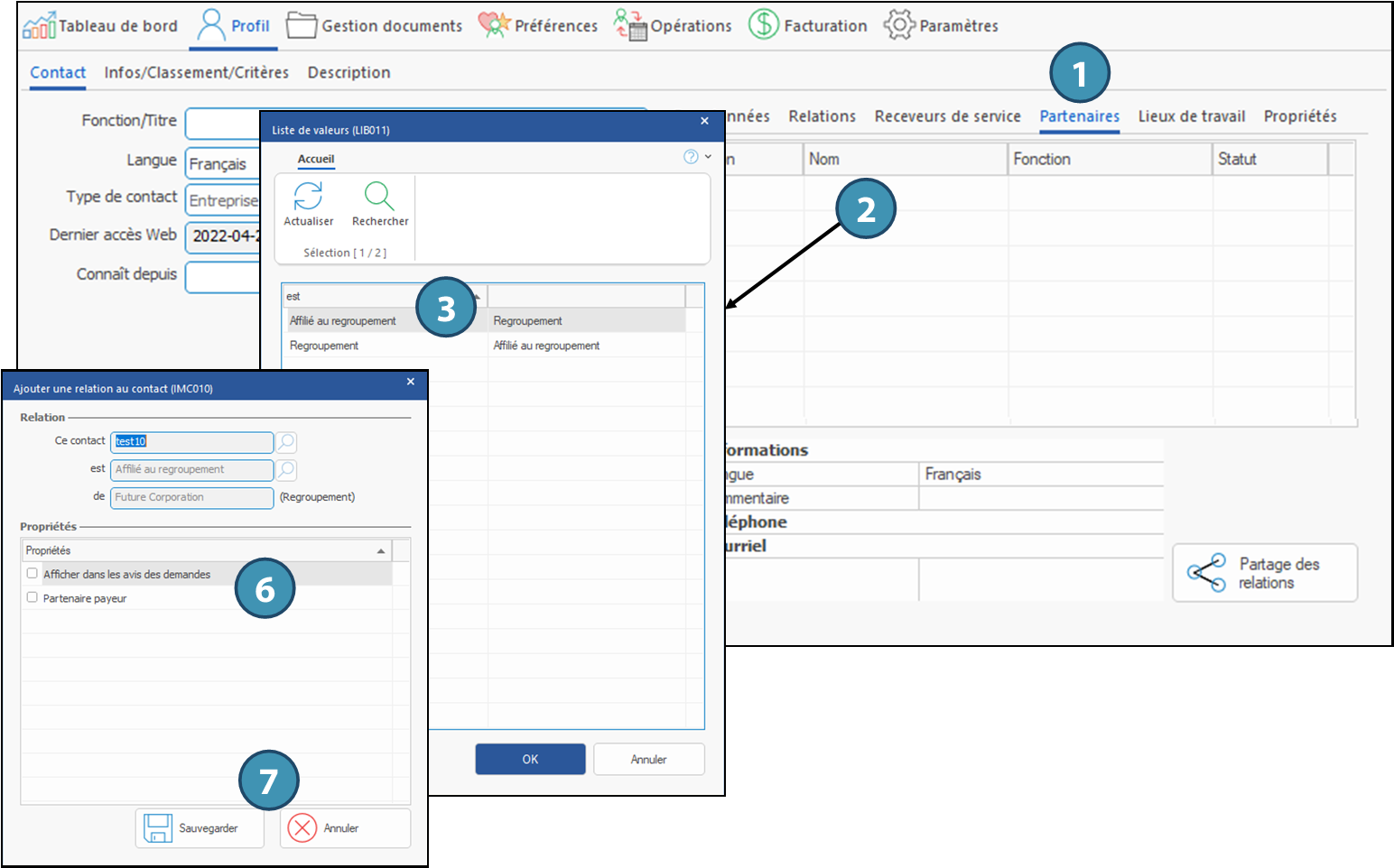 1.Cliquez sur le sous-onglet « Partenaires ». 2.Dans la zone, cliquez sur une ligne vide, la fenêtre « Liste de valeurs » s'affiche. 3.Sélectionnez la ligne indiquant « Affilié au regroupement » dans la première colonne et cliquez sur « OK ». 4.Une nouvelle fenêtre « Client » s'affiche en mode recherche. Recherchez le contact en inscrivant son nom dans le champ Nom complet, cliquez sur l'icone 5.Dans le volet des résultats de la recherche, en vous assurant que le bon client est sélectionné, cliquez sur le bouton Sélectionner le client. 6.La fenêtre « Ajouter une relation au contact » s'affiche. Cochez les propriétés que vous désirez attribuer à ce contact. 7.Cliquez sur le bouton « Sauvegarder » pour ajouter le nouveau partenaire, ou sur « Annuler » pour ignorer l'ajout ou la modification.