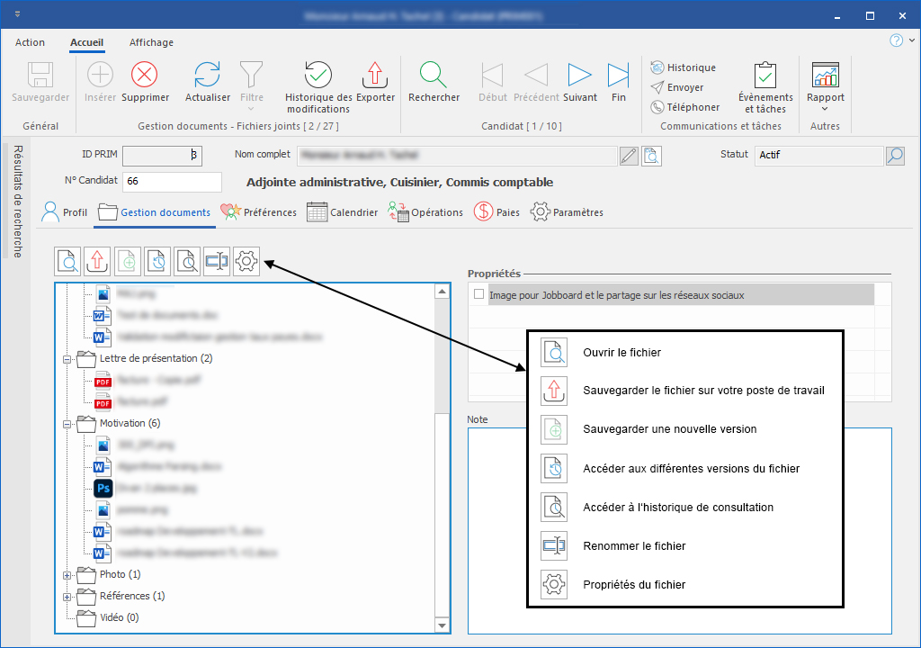 Pour une information détaillée de chaque bouton de l'onglet de gestion des documents, consultez la page Actions liées à un document.