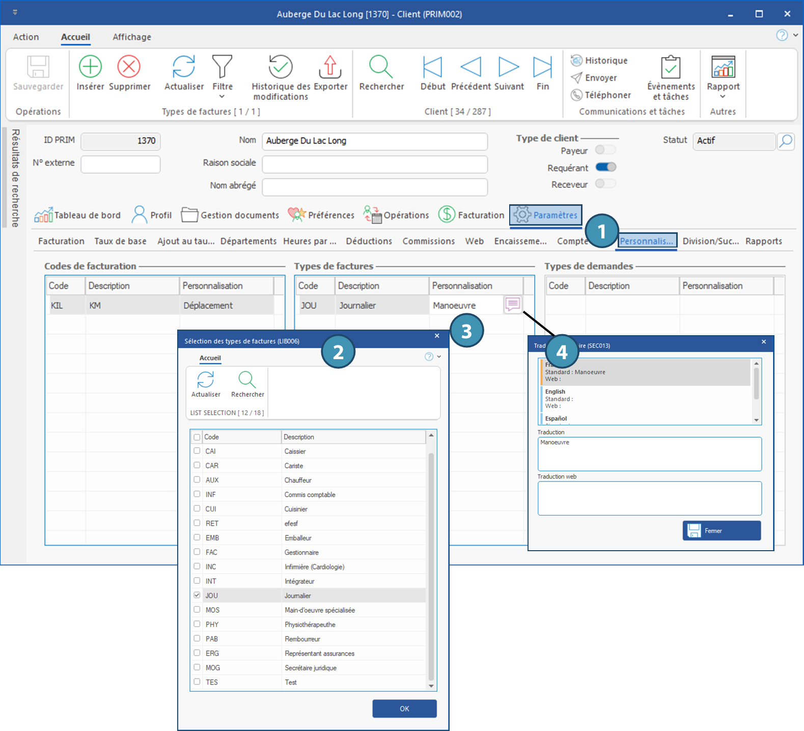 PRIM permet la personnalisation des termes ou des libellés qui s'afficheront sur les factures : vous pourrez ainsi modifier la description des codes de facturation, des types de factures ou des types de quart.