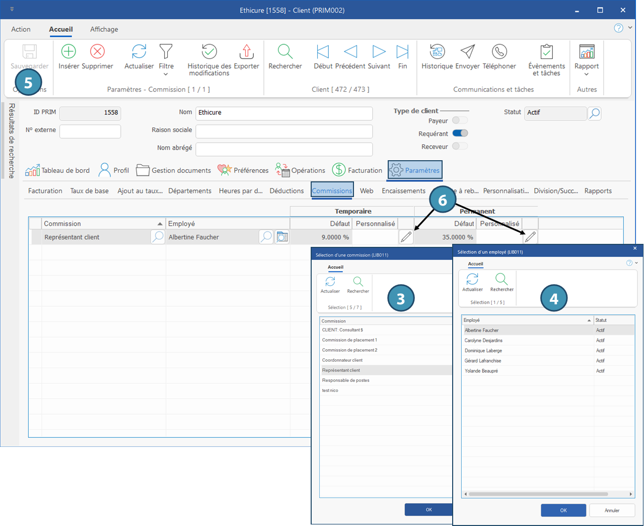 1.Dans un dossier client, cliquez sur l’onglet Paramètres et sur le sous-onglet Commissions.