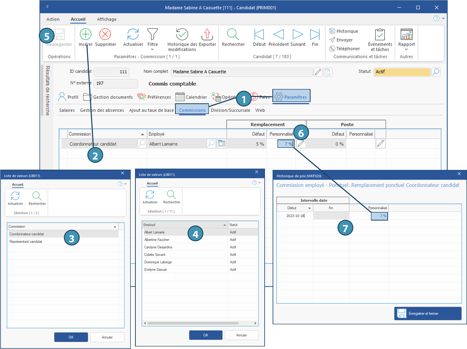 1.À partir d'un dossier candidat, cliquez sur l’onglet « Paramètres » et sur le sous-onglet « Commissions ».