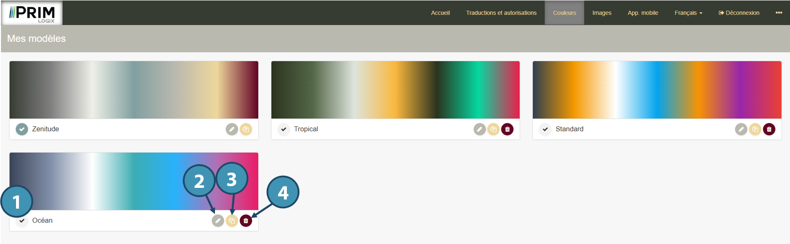 Vous pouvez également modifier (2) ou dupliquer (3) un modèle existant. Enfin, il est possible de supprimer un modèle inactif (4).