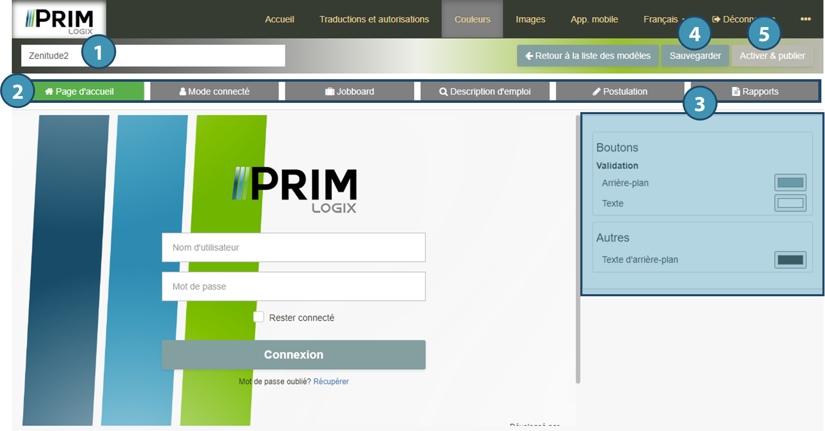 Vous pouvez sauvegarder votre modèle en cours de personnalisation (4) et le publier lorsqu’il sera achevé (5).