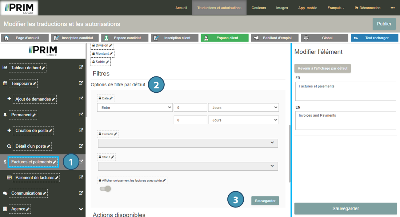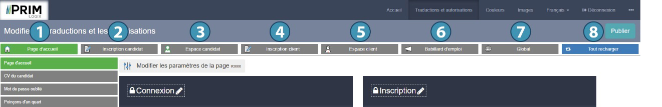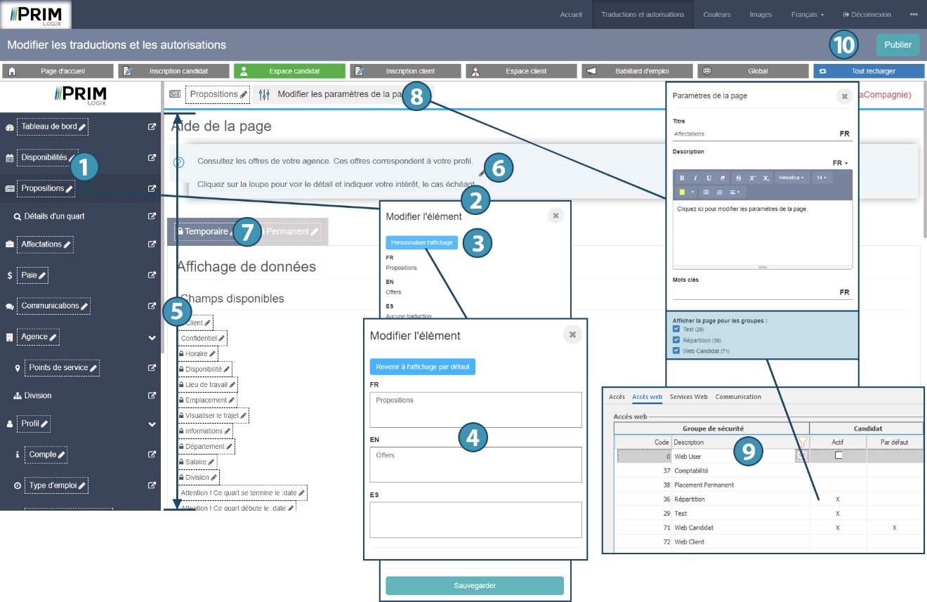 Le menu « Traductions et autorisations » vous permet de modifier l’ensemble des libellés visibles sur le portail Web, à l’exception de ceux qui proviennent directement du logiciel PRIM Logix (par exemple : le titre d’un quart ou une liste de critères).