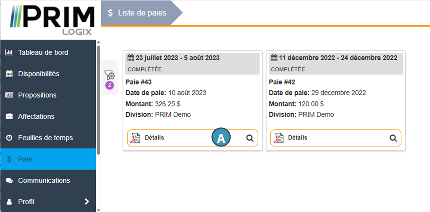 En cliquant sur le bouton « Détails » (A), l’utilisateur pour ouvrir le rapport de paie tel qu’il est configuré par l’agence dans PRIM Logix.