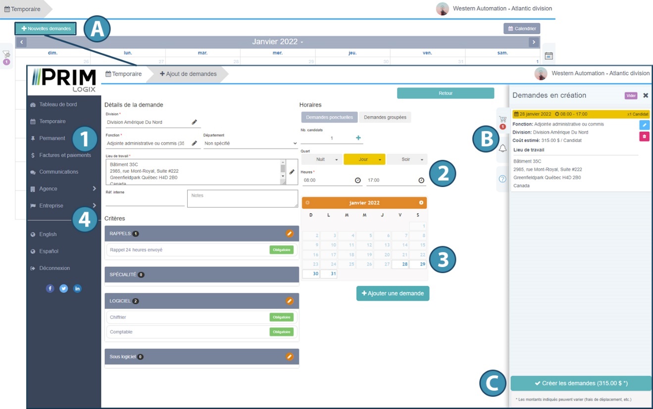 En fonction des configurations souhaitées par l’agence, un client peut créer des demandes à partir de sa plateforme web et les transmettre à l’agence. Il sera également possible de confirmer une demande, ou d'annuler un quart vacant.