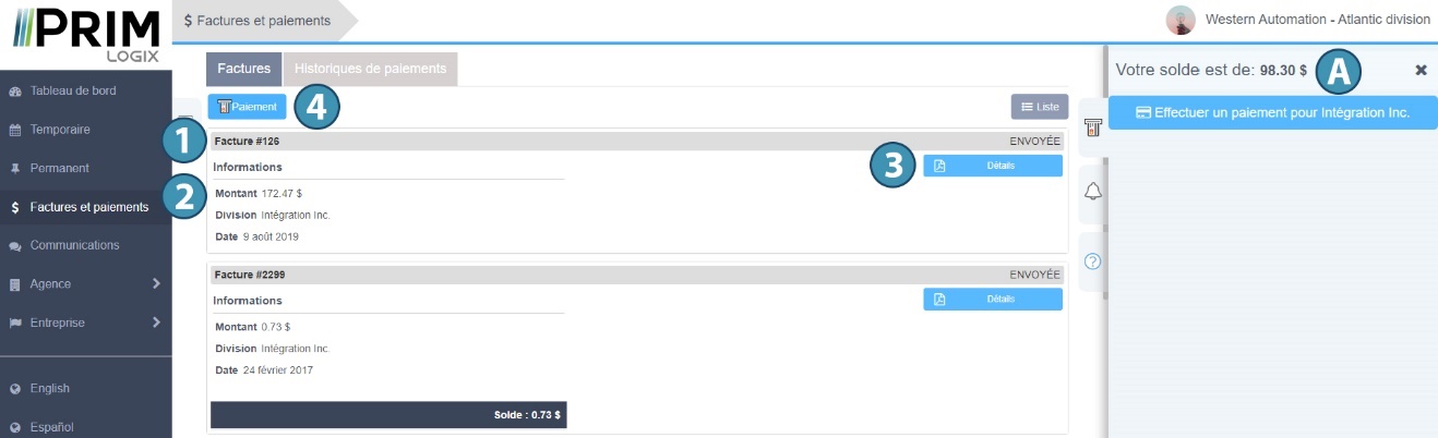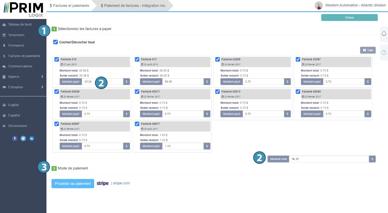 Il doit alors sélectionner la division à laquelle est destiné le versement, s’il y a lieu. Puis, un formulaire lui propose de sélectionner la ou les factures pour lesquelles il souhaite effectuer un paiement (1), ainsi que le montant de ce paiement (2). Enfin, l’utilisateur est invité à sélectionner un mode de paiement (3).