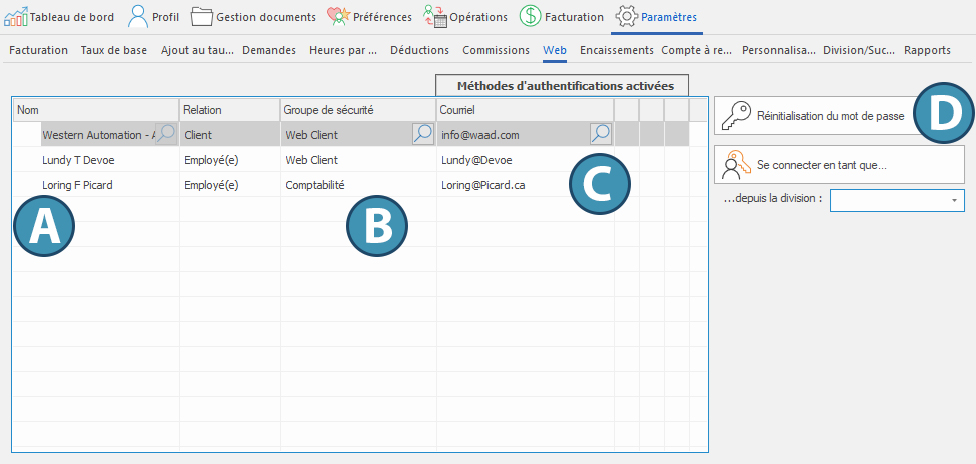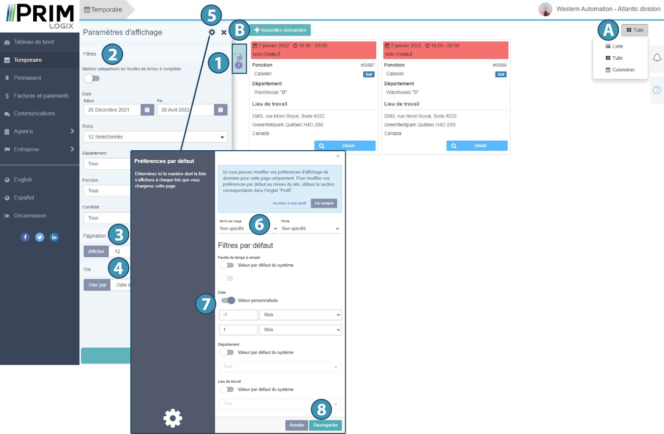 Sur l’ensemble des pages où cela est possible, l’utilisateur peut modifier l’affichage des informations à partir des options proposées. Pour ce faire, il suffit de sélectionner le mode d’affichage souhaité à partir du bouton correspondant (A).