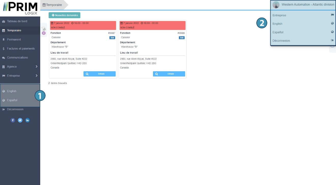 En cliquant dans le menu de gauche (1) ou sur le nom de son entreprise en haut à droite (2), l’utilisateur peut changer la langue d’affichage et se déconnecter du portail Web.
