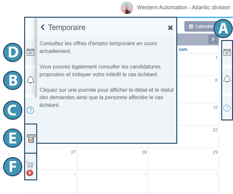 -D : Présent dans la section « Temporaire », l’onglet du calendrier permet de consulter les demandes entrées à la date sélectionnée.