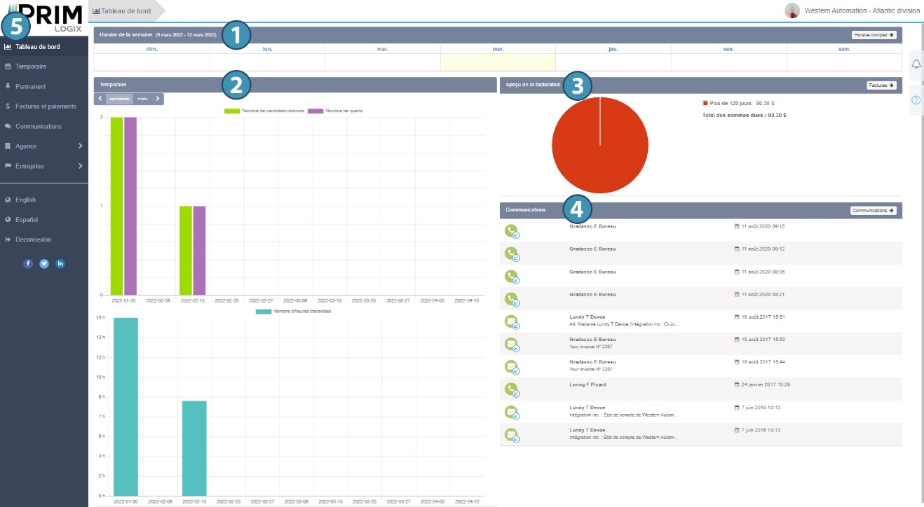 La page d’accueil de l’espace client est un tableau de bord qui présente un résumé des informations pertinentes, présentées sous formes de tuiles. L’utilisateur peut ainsi consulter l’horaire des affectations de la semaine (1), un résumé graphique des affectations à venir (temporaire et/ou permanent) ainsi que des heures travaillées (2), un aperçu de la facturation (3) et des dernières communications échangées avec l’agence (4). Enfin, il peut accéder au fil d’actualité du réseau social de l’agence si celui-ci a été paramétré en ce sens.