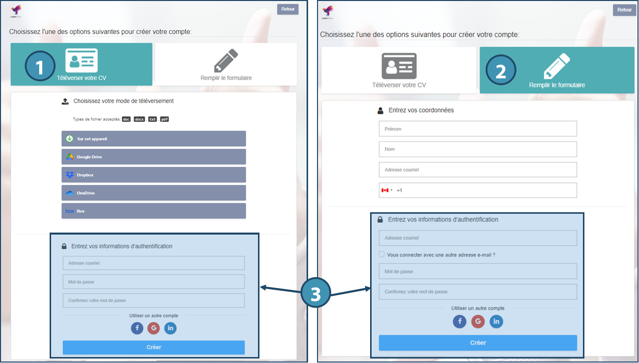 Afin de s’inscrire au portail Web, le candidat peut joindre un CV à partir de son ordinateur ou d’un espace de stockage infonuagique (1).