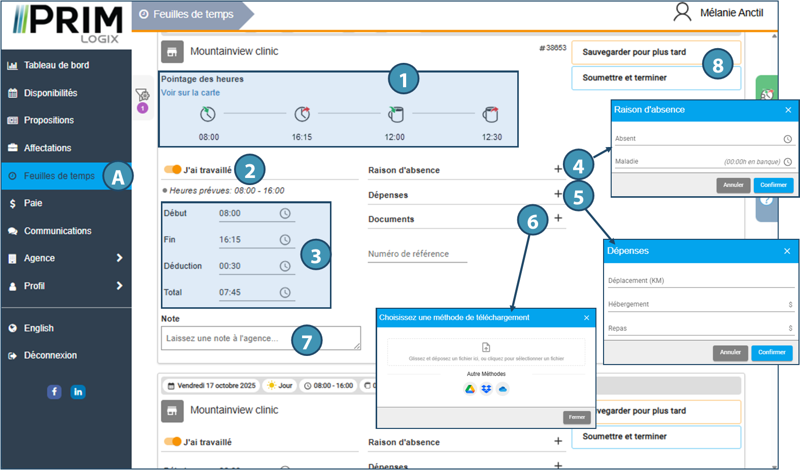 Les feuilles de temps sont disponibles dans la page Feuilles de temps (A), généralement à compter du jour du quart concerné, à moins que l'agence n'aie défini des paramètres différents pour permettre de remplir à l'avance, s'il y a lieu. Par ailleurs, si l'agence le permet, il est également possible d'y accéder à partir de la page des affectations, au moyen du bouton Voir la feuille de temps sur la tuille de l'affectation concernée.
