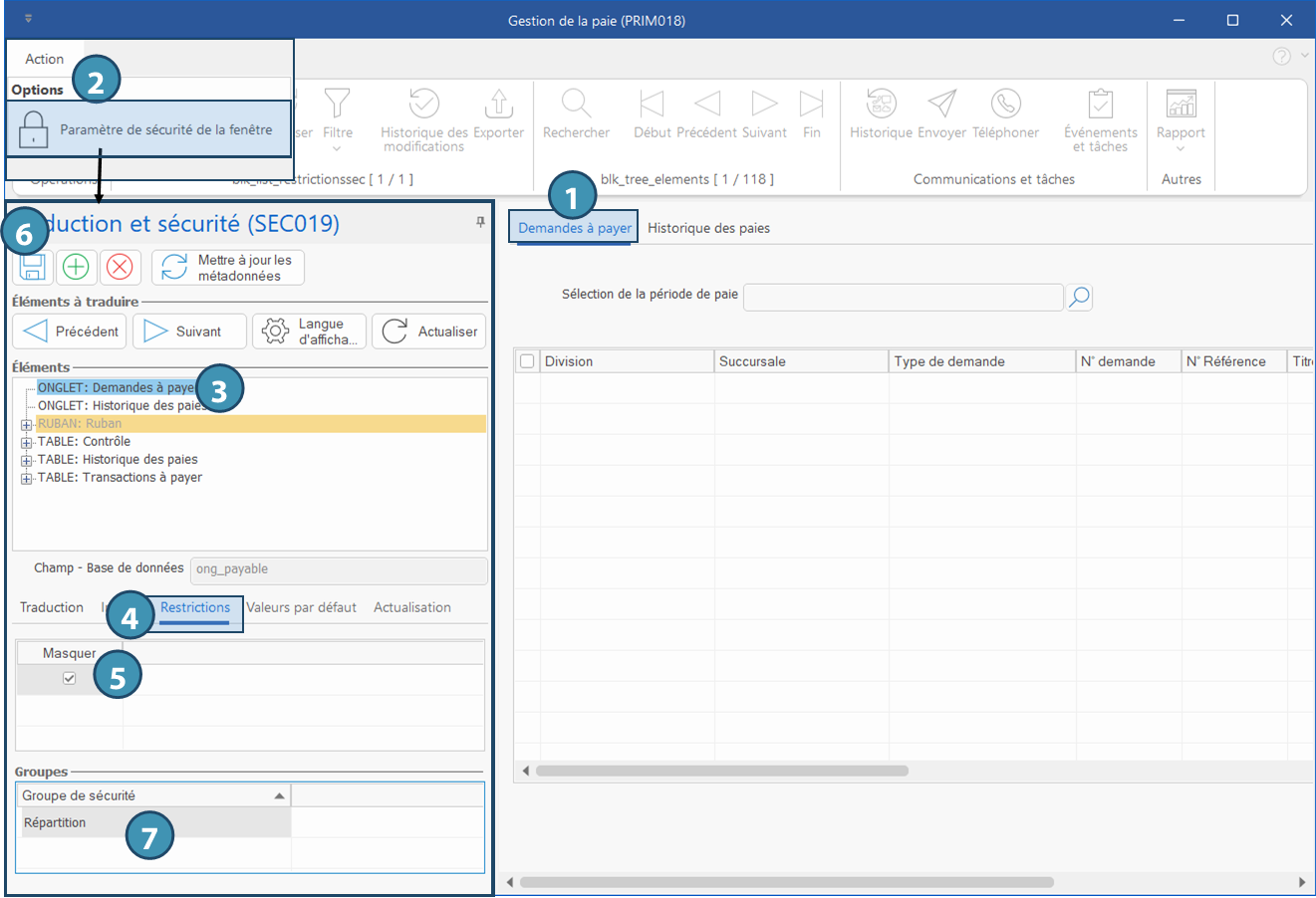 Dans l'exemple ci-dessous, une restriction sera appliquée dans la fenêtre « Gestion de la paie », afin de restreindre l'accès à l'onglet « Demandes à payer ».